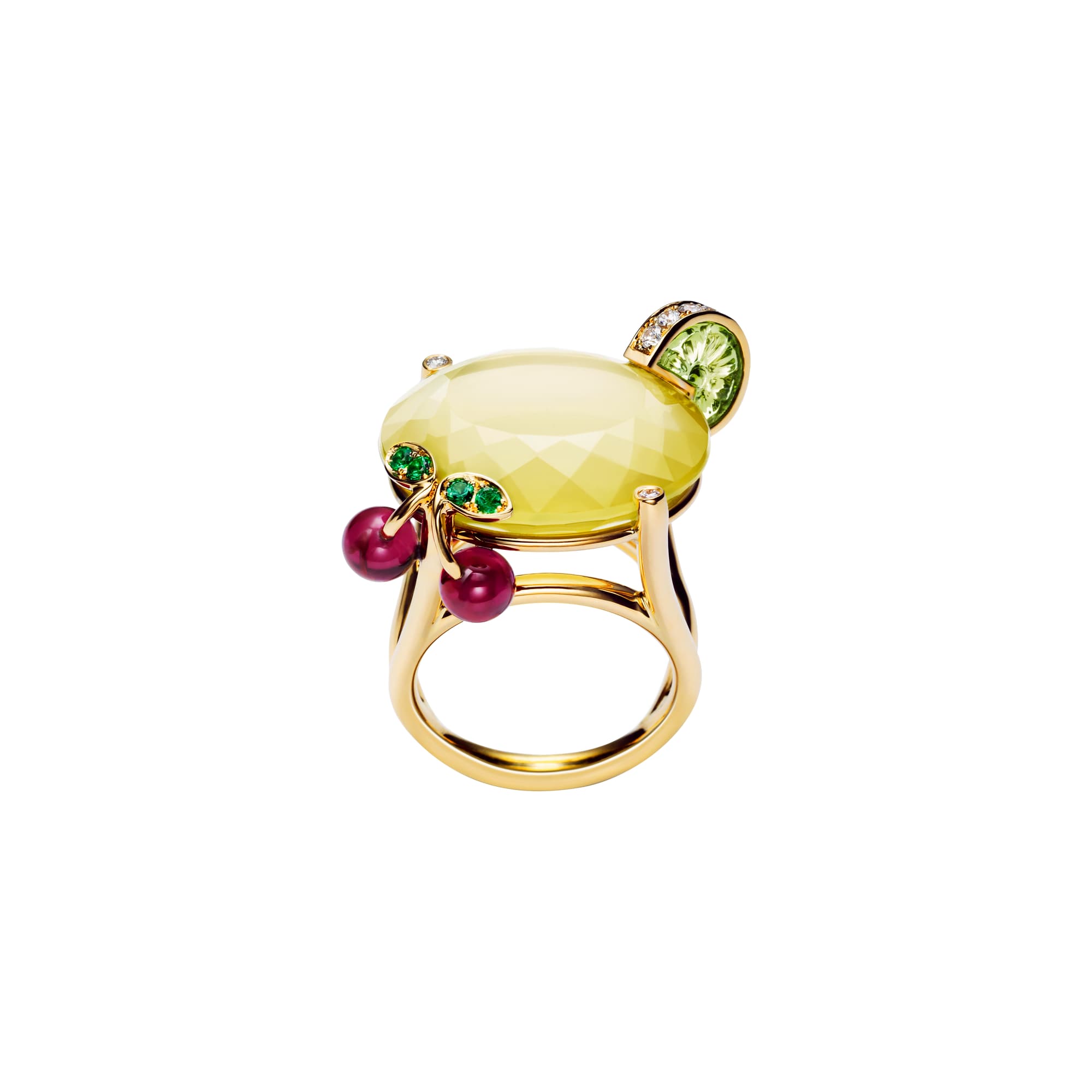 - Ring Limelight Inspiration Cocktail, „Lemon Fizz“ aus 18k Gelbgold, mit 13 Brillanten (ca. 0,28 ct), 4 Smaragden im Brillantschliff (ca. 0,04 ct), einem Zitronenquarz im Ovalschliff (ca. 24,50 ct), 2 Rubellitkugeln (ca. 2,04 ct) und einem geschnitzten Peridot (ca. 2,07 ct) besetzt.
